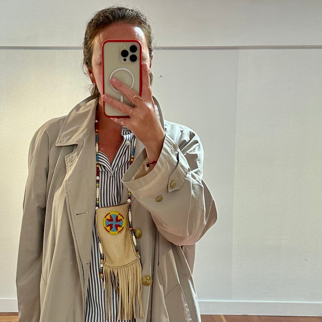 Vintage leather & colorful beaded fringe pouch in light tan.