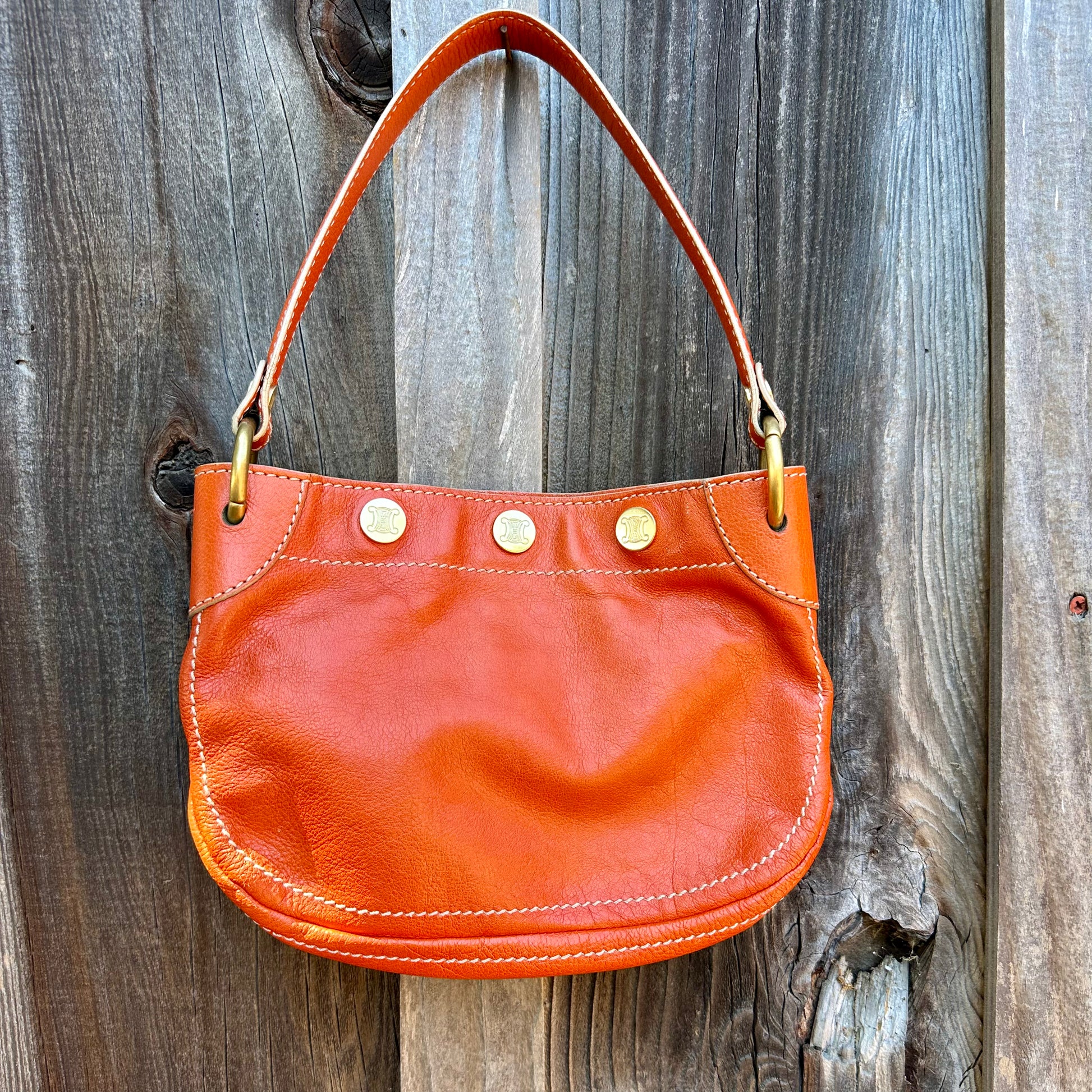 Vintage Celine shoulder bag with gold tone hardware and contrast stitching. One interior zip pocket. Snap closure. Made in Italy.