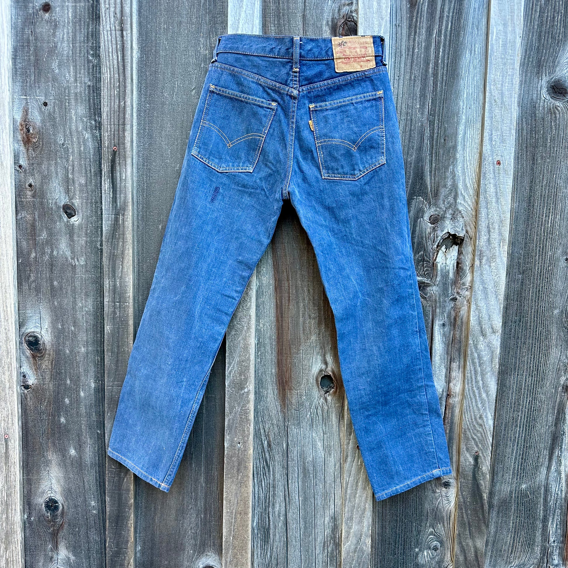 Classic 501, dark with contrast stitching. Very short inseam. Made in USA