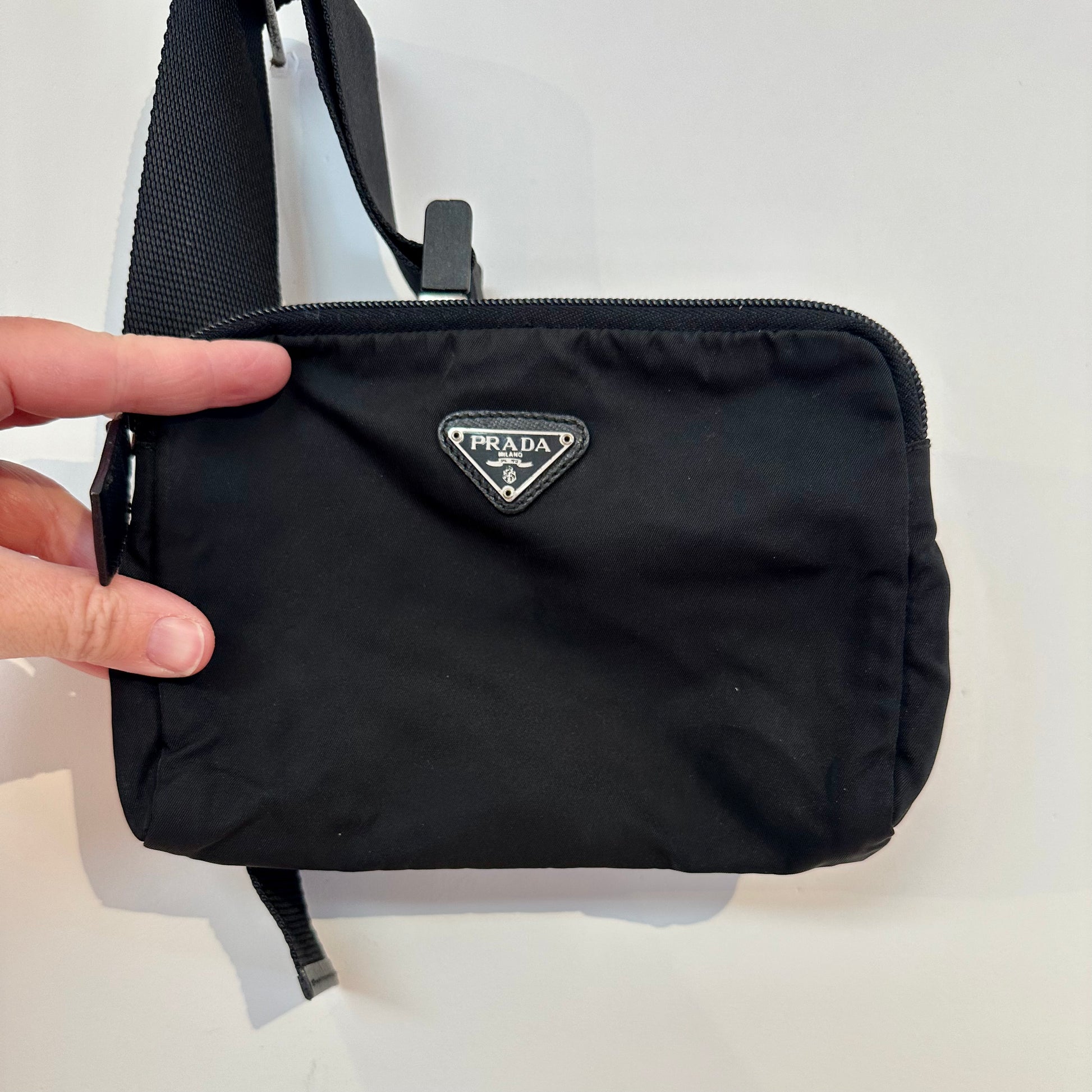Nylon Prada bag with zip closure and sliver tone hardware.
